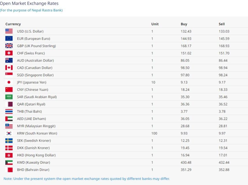 नेपाल राष्ट्र बैंकका अनुसार आज अमेरिकन डलरको खरिद दर १३२ रूपैयाँ ४३ पैसा र बिक्री दर १३३ रूपैयाँ ०३ पैसा रहेको कायम गरिएको छ भने युरो एकको खरिद दर १४४ रूपैयाँ ९३ पैसा र बिक्री दर १४५ रूपैयाँ ५९ पैसामा खरिदबिक्री हुनेछ ।